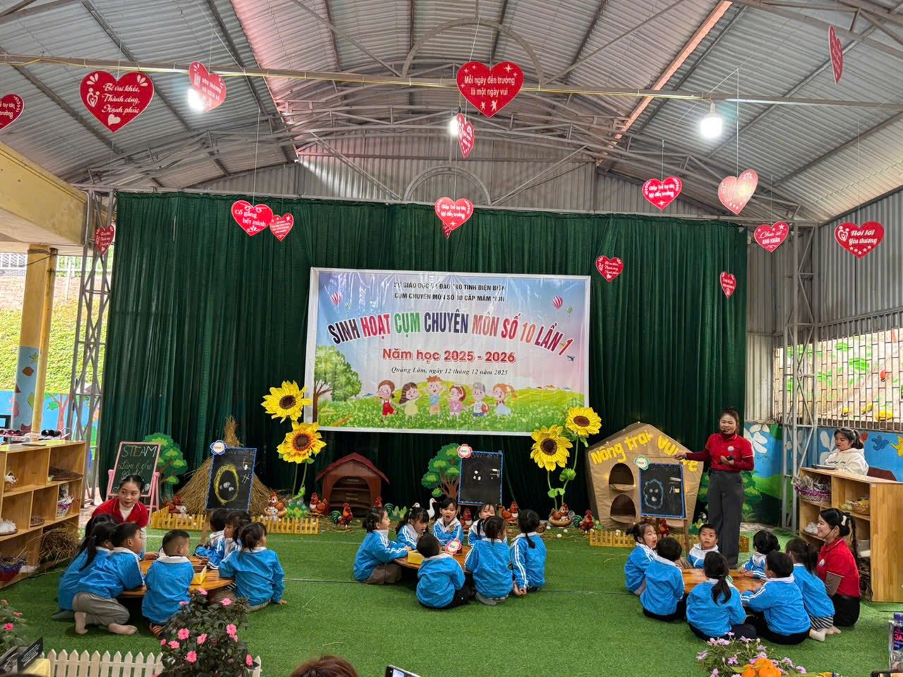 SINH HOẠT CỤM CHUYÊN MÔN SỐ 10 LẦN 1 NĂM HỌC 2025-2026Căn cứ Công văn số 1148/QĐ-SGDĐT ngày 09/9/2025 của Sở GD&ĐT về việc Thành lập các Cụm chuyên môn cấp học mầm non. Căn cứ Công văn số 2717/SGDĐT-GDMNTH ngày 11/9/2025 của Sở GD&ĐT về việc Tổ chức các hoạt động chuyên môn theo cụm trường cấp học mầm non.Căn cứ vào kế hoạch số 95/KH-CCMS10 ngày 06/10/2025 của Cụm chuyên môn số 10 về Kế hoạch sinh hoạt chuyên môn cụm số 10 năm học 2025-2016.Sáng ngày 12/12/2025, cụm chuyên môn số 10 đã tổ chức sinh hoạt chuyên môn lần 1 tại Trường Mầm non Na Cô Sa - xã Quảng Lâm. Được các đ/c Lãnh đạo chuyên môn Sở GD&ĐT ủy quyền cho đ/c Cụm trưởng điều hành buổi sinh hoạt chuyên môn.Về dự buổi SHCM có các đ/c Hiệu trưởng, Phó hiệu trưởng và giáo viên cốt cán của 13 đơn vị trường mầm non tại các xã: Sín Thầu, Mường Nhé, Mường Toong, Nậm Kè, Quảng Lâm.Nội dung chia sẻ, thảo luận đi sâu vào nội dung mới, vướng mắc của 13 đơn vị trong cụm như sau:✨ Trường Mầm non Na Cô Sa: Hướng dẫn làm ổ cho gà đẻ trứng lớp mẫu giáo 5-6 tuổi. ✨ Trường Mầm non Nậm Kè: Chia sẻ thảo luận về ứng dụng CNTT và chuyển đổi số. ✨ Trường Mầm non Quảng Lâm: Chia sẻ công tác tạo môi trường TCTV cho trẻ.Tại buổi sinh hoạt, các CBQL, giáo viên cốt cán đã có ý kiến, đóng góp vào hoạt động và chia sẻ, từ đó đưa ra những giải pháp khắc phục và thống nhất triển khai thực hiện chung trong cụm.Buổi SHCM lần 1 của cụm số 10 là khởi đầu các hoạt động gắn kết, nâng cao chất lượng nuôi dưỡng chăm sóc giáo dục trẻ của các trường trong cụm để thực hiện thắng lợi nhiệm vụ năm học 2025-2026.Dưới đây là một số hình ảnh buổi sinh hoạt chuyên môn.